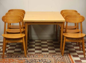 VVilka snygga stolar! My God! Bordet var tyvärr ingen höjdare alls. De här stolarna ska ha ett svart häftigt bord. Det är 6 stolar  i teak. Bordet verkar mestadels vara i ek. Utrop 1200 kr. Möblemanget är från Hagafors Bra Bohag.