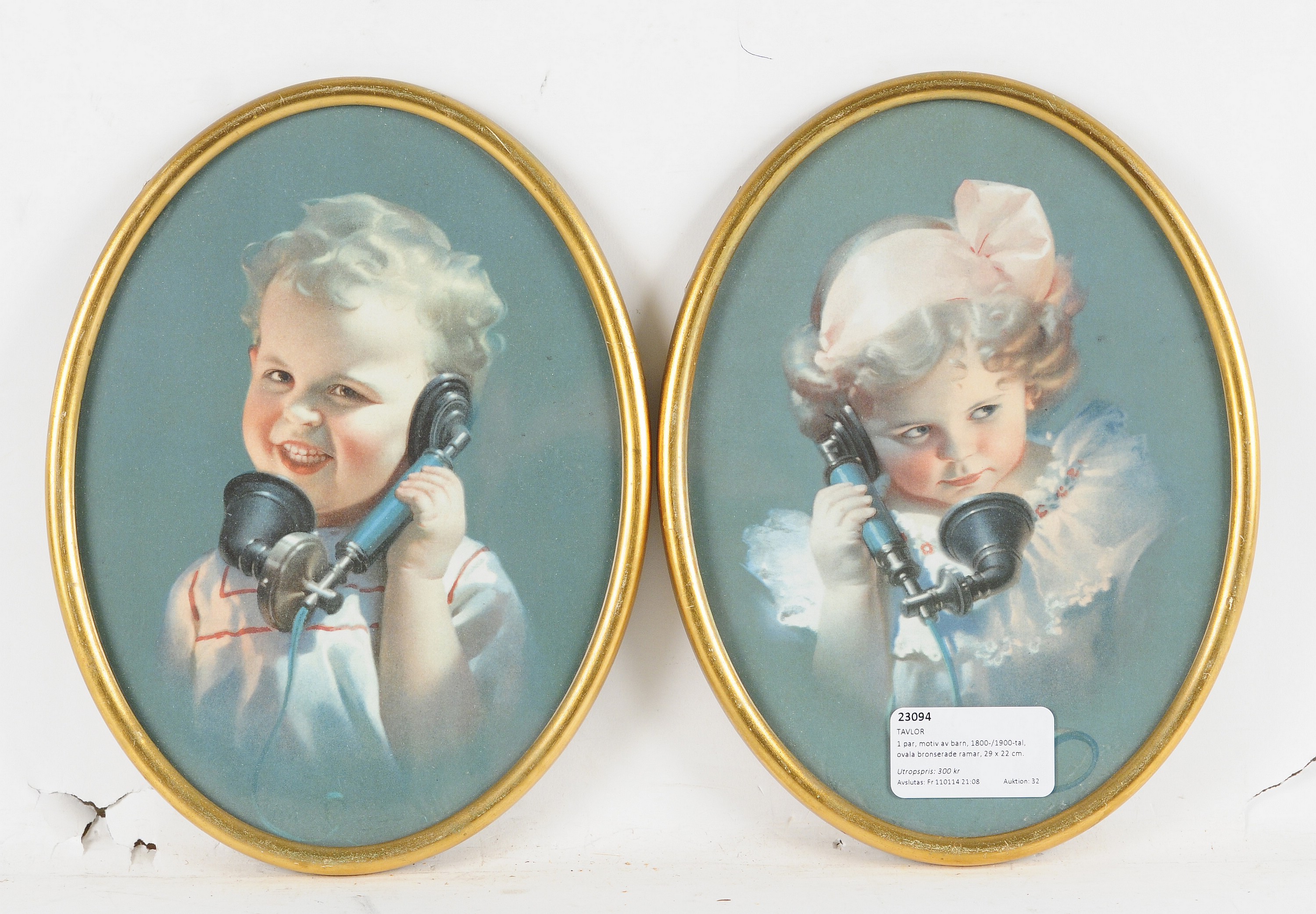De här tavlorna är från tidigt 1900-tal. De ovala bronserade ramarna är 29 x 22 cm. Utropet är 300 kr och auktionen avslutas den 14 januari på Norrköpings Auktionsverks webbauktion.