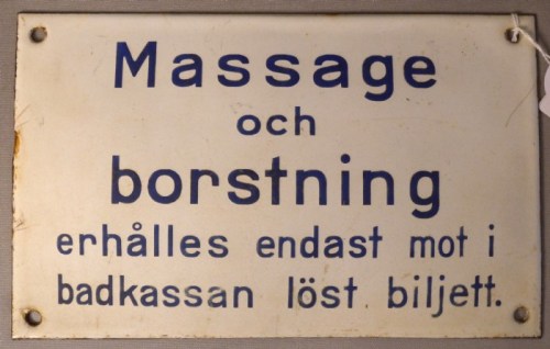 En sådan här emaljskylt är ju rolig. Massage och borstning. Jo jag tackar jag. Helst vill man ju hitta en sådan lite billigt på en loppis. Men nu tror jag inte den kommer att bli så värst billig precis. Storleken står det inget om i katalogen.