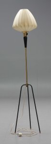Den andra är en mer anonym lampa från 50-talet som är svartlackerad med mässingsdetaljer. Höjd 140 cm, Snygg den med. Utrop 800 kr.