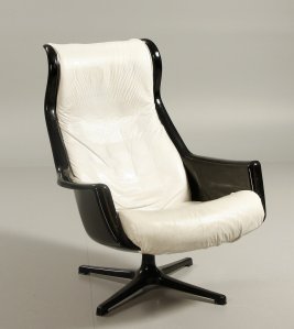 Är inte fåtöljen som ett utropstecken?! Den formligen lyser 70-tal. På ett positivt sätt. Den heter Galaxy och gjordes av Alf Svensson och Yngvar Sandström för Dux. Materialet är svart plast med klädsel av vitt konstläder. Så den kan bli lite klibbig att sitta i för länge. Men utseende före funktion som jag brukar säga! Utrop 1500 kr och auktionen avslutas 21 januari.