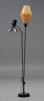 Den första 50-tals golvlampan är av Hans Bergström för Atelje Lyktan. Den är hur häftig som helst. Jag gillar att det är två olika lampor i samma. En läslampa och en mera allmänbelysning. Höjden är 152 cm Den är svartlackerad och i mässing. Utrop 2500 kr.
