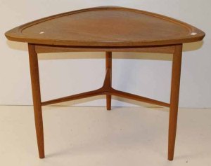 Jag går verkligen igång på dessa fladdermusstolar från 50-talet och det trekantiga teakbordet. Fladdermusstolarna har galonklädsel och de verkar ju vara i gott skick. Hur snygga som helst! Bordet är danskt 60-tal. Det är brännstämplat med Danish Furnituremakers Control. Längden är 77 cm.