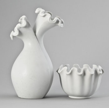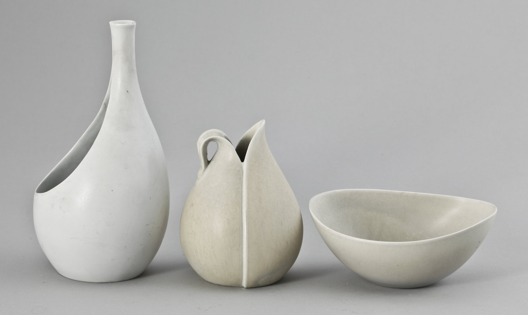 På första bilden finns förstås vasen och skålen Våga av Wilhelm Kåge för Gustavsberg. De är som alltid i stengods med carraraglasyr, dvs en vit matt glasyr. Delarna är stämpelmärkta. Skålens höjd är 10 cm och vasens 29 cm. Min mamma har några delar ur serien och jag tycker de är så snygga. Utropet är 1500 kr och auktionen avslutas 26 januari.