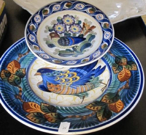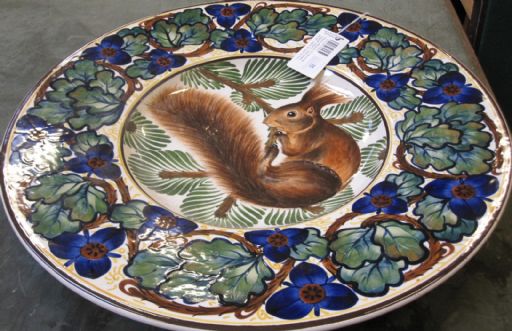 Det är fat i fajans i olika storlekar som ropas ut. De är från 1900-talets början. Ekorrfatet har en diameter på 45 cm. De andra 31 resp 20 cm. Inte min stil men kul att lära sig nåt nytt. Och det är ju klara och starka färger på faten.