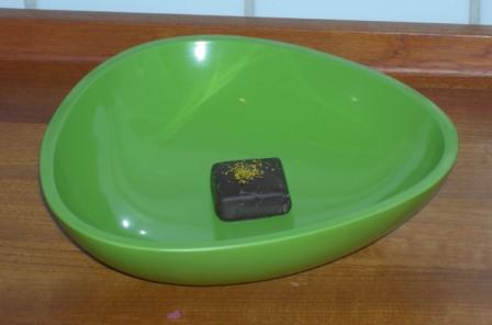 En liten 50-talsskål i, som jag tror, melamin. Det är ingen tunn liten pjäs utan den är rätt tjock. Den passar så bra till kvällens tre goda chokladbitar som jag bara måste ha. Varje kväll. Färgen är jättefin vilket inte riktigt syns på bilden. Inte skrikig alls. Skicket är perfekt. Den är säkert aldrig använd. Jag har sett skålen i svart också. Den skulle jag förstås också gärna ha!