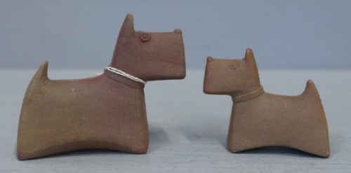 Två vovvar av Stig Lindberg i lergods. Kanske kan vara något för er som tröttnat på hans sparbössor i plast som han gjorde för Handelsbanken. Dessa i lera är 7-9 cm höga och ropas ut för 400 kr. Charmiga!