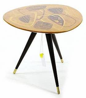 Det bästa till sist. Ett schysst bord i teak med inläggningar´från Sundlings möbelfabrik, Tranås 1964. Diametern är 56 cm. Utropet är 1500 kr.