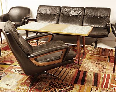 På första bilden ropas fåtöljen i förgrunden ut tillsammans med soffan i bakgrunden. Soffan är tydligen i dålig skick men jag tyckte fåtöljen såg lite rolig ut. Båda möblerna är skinnklädda och ropas ut för 2500 kr. Mattan man ser på bilden passar ju rätt bra till. Det är en nu för tiden så trendig lapptäcks-kelim med utropet 9000 kr. Soffbordet är i teak och turkosaktig mosaik med utropet 1200 kr. Snyggt.