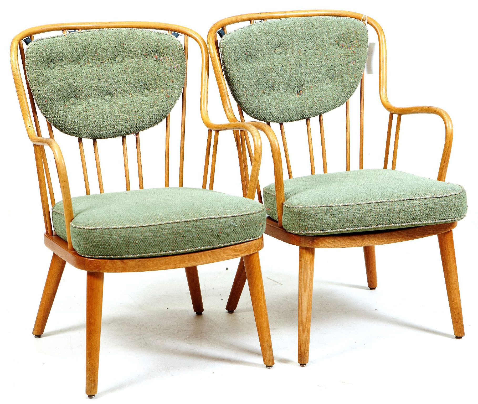 Ett par karmstolar i alm i design av Aage Herman Olsen. De är tillverkade av Kocks Malmö och ropas ut för 6000 kr. De har sin charm. Lite speciella.