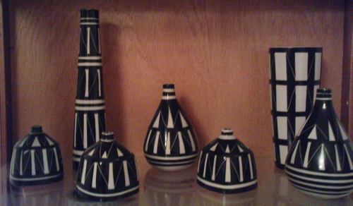 Min kompis Juan, som för övrigt har Sveriges (kanske världens) största samling av Stig Lindbergs Domino, har även den här samlingen vaser från Gustavsberg. De är designade av Karin Björquist och serien heter möjligen Diagonal. Juan säger att de inte är särskilt lätta att få tag på och att han gärna skulle vilja ha lite mer info om serien. Jag vet ju att det finns en enorm kunskap hos er så jag skulle vilja fråga om det är någon som vet något om serien? När den tillverkades? Hur många delar finns det? Ja ni fattar…… De små vaserna är 10 cm höga så vet ni ungefär proportionerna.