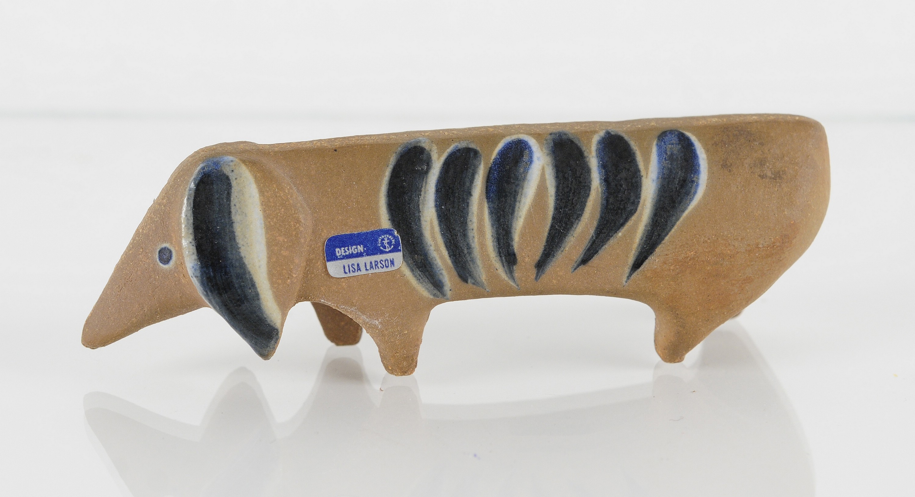 Det här var en ganska kul hund (tax?) av Lisa Larson förstås för Gustavsberg. Den är 14 cm lång. Utrop 200 kr (25 feb).