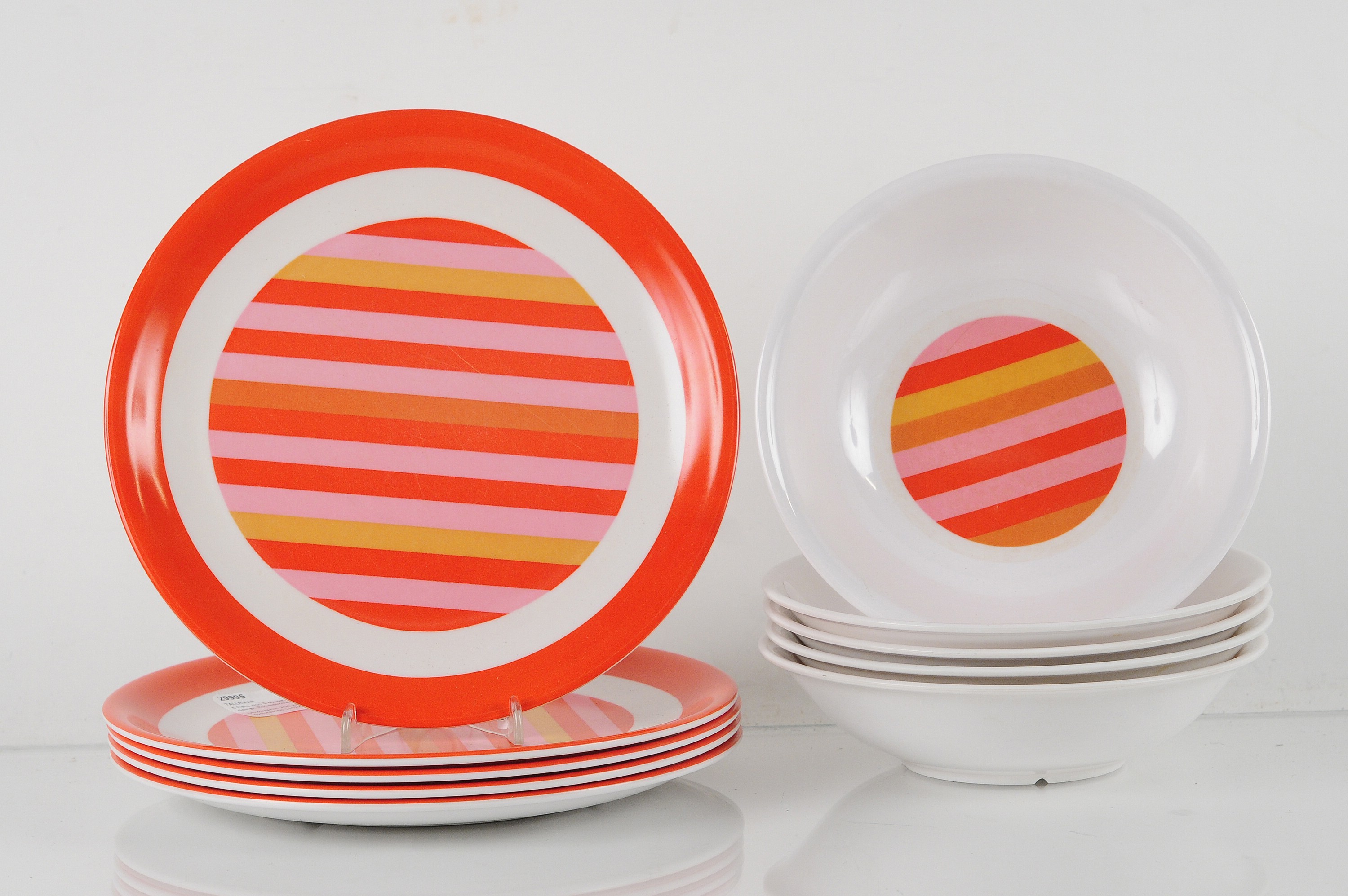 Det här är förstås inte keramik utan ornamin. Det är 5 flata och 5 djupa tallrikar ur serien Reflex i design av Rut Beskow för Gustavsberg. Utrop 200 kr (27 feb).
