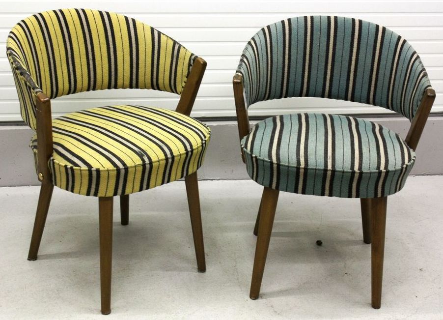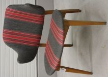 De två första stolarna är förstås i teak och det är roligt att de har lika klädsel fast i olika färger! Men tyget verkar slitet. Den andra är också i teak och har ett ganska stiligt tyg. De första två ropas ut för 400 kr liksom den andra. Avslut 2 resp 1 mars.