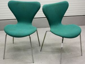 De klädda Sjuanstolarna av Arne Jacobsen har en bra 50-talsfärg (men det är förstås ingen teak). Utropet är 1000 kr med avslut 6 mars.