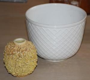Först det bästa 🙂 En jättestor ytterkruka av Sven Erik Skawonius (1908-81) från Upsala-Ekeby Karlskrona. Den är 16 cm hög och diametern upptill är 21 cm. Snygg va? Linda på bloggen Porslinan kanske skulle kunna slå upp i sin nya fina bok om Skawonius och kolla vad modellen heter 😉