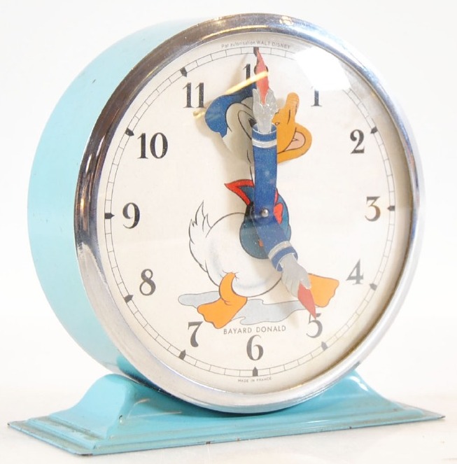 Brevid en väckarklocka från Frankrike med en känd seriefigur på, Kalle Anka. Som för övrigt mina barn knappt vet vad det är för nånting. Nu är det annat som gäller, typ Super Mario (där särskilt Super Mario Mushroom är snygg). Väckarklockan är från 50-60-talet och är 12 cm hög. Buden är uppe i 175 kr.