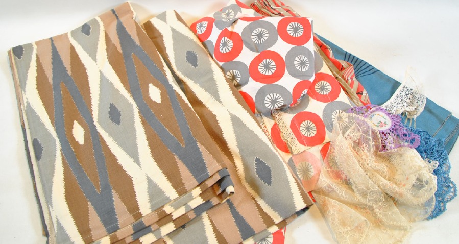 Till sist ett parti med textilier från 50/60-talet som ser intressanta ut. Det är gardiner etc. Inga bud lagda än. Textilier var för några månader sedan det sista jag skulle bry mig i men efter att ha följt allehanda trevliga bloggar om retrotextilier så är jag också fast! Men jag hinner aldrig sy (även om jag faktiskt kan en del, mamma var textillärare innan pensioneringen).