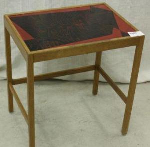 Till fåtöljerna ett mindre bord med emaljarbete, signerat -52. Jättecoolt. Som ett konstverk. Utropet är 1000 kr (24 mars).