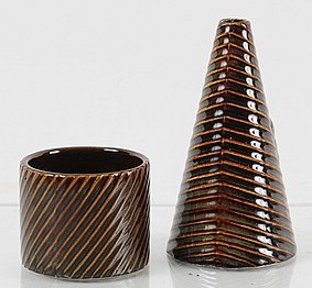Till sist en vas och ciggarettmugg ur Stig Lindbergs Dominoserie för Gustavsberg. Fast inte i svart/vitt utan i brunt. Utrop 500 kr (27 mars).