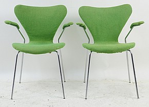 Två sköna Sjuan stolar av Arne Jacobsen i vårgrön ullklädsel. Oemotståndliga! Utrop 2000 kr (29 mars).