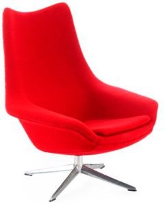 Brevid tavlan en knallröd fåtölj. Det gillar jag. Den är av H.W. Klein och det är tyskt 1950-60-tal. Den är omklädd och ser fräsch ut, iallafall på bild. Utropet är 6-8000 kr.