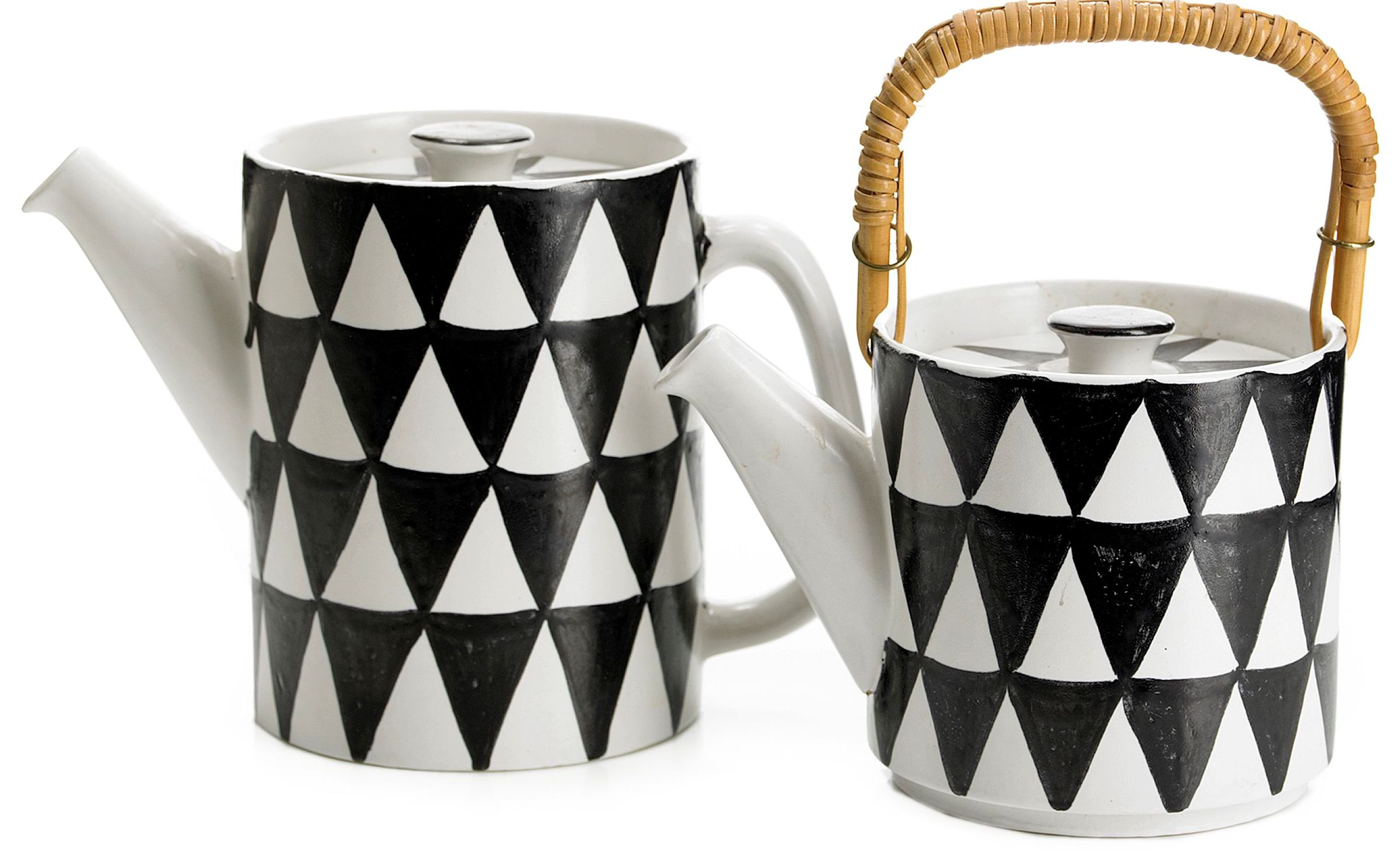 Här är en grafisk dubbelkanna i fajans av Stig Lindberg för Gustavsberg. Signerade Gustavsbergs studio SWEDEN T/7 100. Höjderna är 10 respektive 13 cm-. Utrop 3-4000 kr.