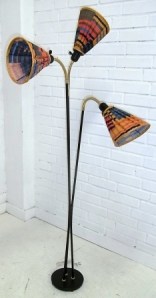 Trearmad golvlampa från 50-talet. Tygskärmarna ser ok ut men vill man ha något annat tyg så är det nog relativt lätt att byta. Utrop 1000 kr.