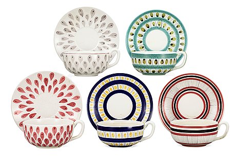 Fem tekoppar av Stig Lindberg för Gustavsbergs Studio, signerade med studiohanden. Kul att duka med! Men smakar det så kostar det! Utrop 3500-4000 kr. Jag vet inte vem som köper dessa, så kul är de kanske inte.