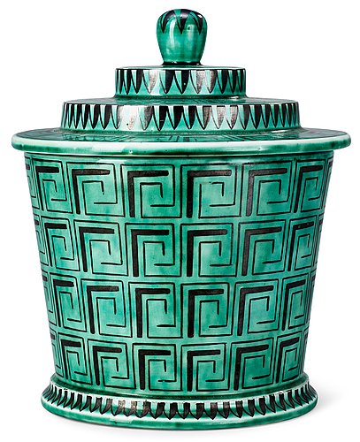 En stilren tobaksburk i Argenta-serien av Wilhelm Kåge för Gustavsberg. Den är från 30-talet och 23,5 cm hög. Utrop är 4000-5000 kr.