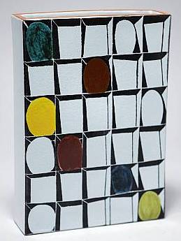 Den snygga vasen ovan med geometriskt mönster är av Stig Lindberg. Jag tror att den ingår i serien Karneval fast mönstret är väldigt olikt de andra delarna (till höger ett mer representativt mönster). Vasen är märkt Gustavsberg studio och höjden är 29 cm. Utrop 2000 kr.