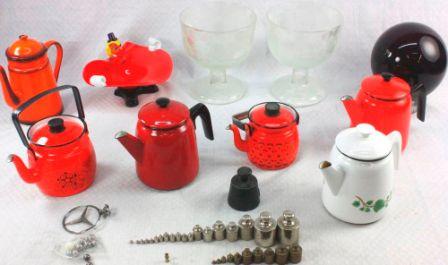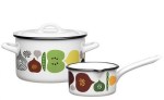 Ett parti snygg emalj och lite till. Retroemalj är ju helt fantastiskt men Gila på Gilas Grotta har kommit på att Hackman faktiskt nytillverkar köksföremål i emalj. Bilden till höger. Supersnygga. Oklart dock om de fanns att köpa i Sverige. Budet på partiet med de röd-oranga kannorna är iallafall uppe i 80 kr.