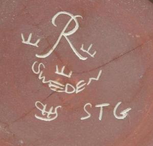 Söt bricka som jag kanske ger bort i present. Från danska IRA konstigt nog. Vasen var jag särskilt nöjd över tills jag kom hem och såg en sytrådstunn lång spricka. Den står nu utomhus på ett bord och gör sig bra där. Där rök 10 kr. Den är från Rörstrand med signering enligt nedan. Är det möjligen någon som kan tala om vem som gjort den? HS och STG står det.