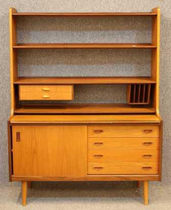 Först en bokhylla i teak med utdragbar skrivskiva. Bredden är 120 cm. Något för det lilla hemmakontoret?! Högsta bud just nu är 50 kr (3 aug).