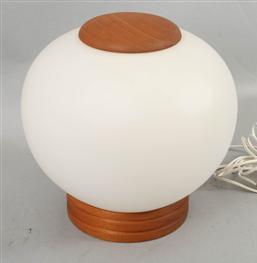 Bordslampa i teak och opalglas tillverkad av möbelsnickare L.Å Olsson (1929-2000). Han avlade sitt gesällprov och fick sitt gesällbrev 1950 med betyget ”Berömlig skicklighet”. Högsta bud 325 kr (11 aug).