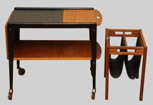 Mycket snygg serveringsvagn i teak av Yngve Ekström (ni vet han med Laminofåtöljen). På köpet får man ett tidningsställ som också det ser ut att vara i teak. Utrop 500 kr.