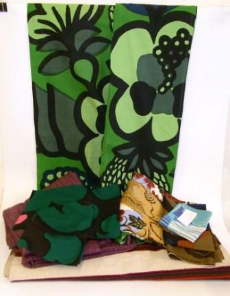 Katalogens beskrivning: Parti textil bl.a duk, kappa samt bordstabletter Marimekko; lila gardinlängder; duk ‘Parabeli’ Saini Salonen m.m. Utropet är 1000 kr. Jag tycker att det gröna tyget är fantastiskt snyggt! Men är inte 1000 kr lite mycket?