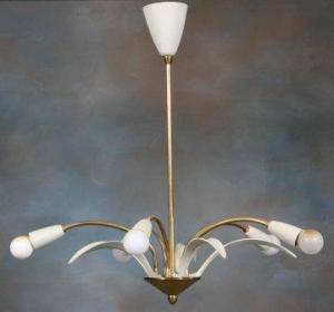 Som kronan på verket en taklampa i mässing och målad metall. Utropet är 600 kr.