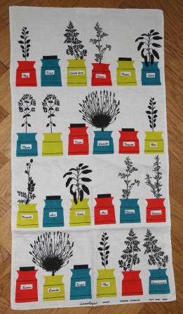 Persons kryddskåp av Astrid Sampe för Almedahls. Jag fick ge 50 kr för den vilket kanske var lite mycket men den är i gott skick. Säljaren var en äldre dam som hade koll på vad det var för någonting. Jag har en likadan handduk tidigare fast i annan färgställning som min mormor gav mig.