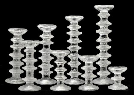8 stycken ljustakar i olika höjder ur serien Festivo av Timo Sarpaneva för Iittala. Ljusstakarna såg dagens ljus 1966. Den här samlingen gillar jag verkligen.  Någon har bjudit 1100 kr. Det är egentligen inte så mycket för något som omedelbart blir ett blickfång hemma! Slå till vetja! Det hade jag gjort om jag hade haft plats!