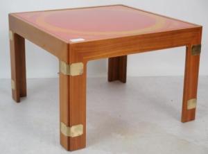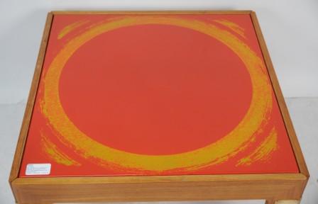 Bara lite kitschigt soffbord i teak med metallbeslag. Skivan är i emalj och orange-röd. Inget för er som gillar stilrena hem men kanske för er som vill skapa ett personligt, färstarkt hem för liten peng. Budnivån är på 100 kr (4 okt).