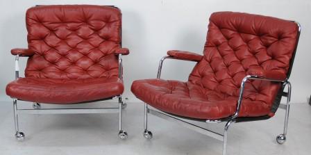 Väl ingådda Karin-fåtöljer av Bruno Mathsson i rött skinn går definitivt att ha till bordet. Tillverkade av Dux och högsta bud är just nu 2500 kr (6 okt). Billigt för två fåtöljer. Obs Auktionshuset har missat att skriva ut designerns namn och fåtöljernas namn. Inte bra. För säljaren.