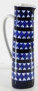 Först några objekt från Gustavsbergs Studio, signerade med studiohanden. Tillbringaren är 27 cm hög. Tyvärr anger inte katalogen varken formgivare eller ev namn på dekoren. Kan det vara Stig L? Den är snygg iallafall och högsta bud är 150 kr (7 okt).
