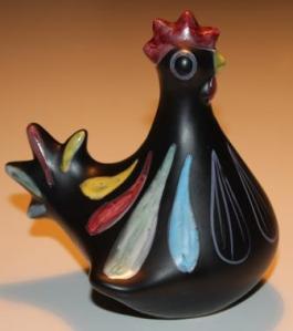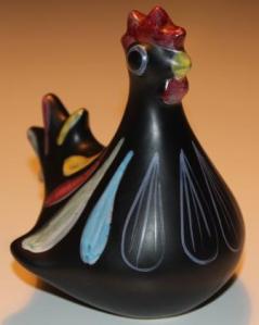 Väldans fin tuppsparbössa. Skulle tro att den är från Syco Keramik. Har sett en likadan fast med lite annorlunda dekormålning. Det är så snyggt när det är färgglad dekor på svart botten. Toppenfynd!