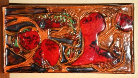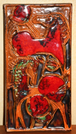 En keramiktavla (lite dåligt foto) från Tilgmans med älsklingsfärgerna rött-orange. Den är rätt stor typ 40 cm hög. Motivet är hästar om det inte framgår. Helt felfri. Inte minsta nagg.
