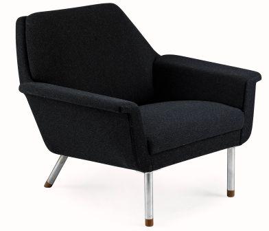 En jättesnygg fåtölj i gott skick. Den är förstås dansk och formgiven av Illum Wikkelsö. Gillar verkligen detaljen med de teakskodda stålbenen. Den är skyltmärkt ILLUMS BOLIGHUS KØBENHAVN. Utrop 8-10 tkr.