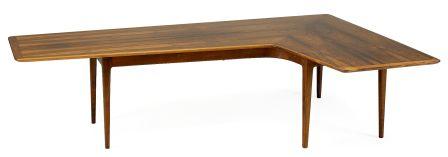 Ett lustigt hörnsoffbord, sannolikt svenskt 1960-tal. Bilden är urdålig. Träådringen på det här bordet är som ett konstverk i sig men det syns ju inte här. Träslaget är jakaranda. Utrop 8-10 tkr.