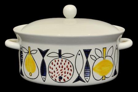 Dekorativ karott ur serien Pomona av Marianne Westman. Det är då Rörstrand förstås. Serien kom 1956. Högsta bud är 200 kr. Visst slitage och missfärgningar leder till ett bud just nu på 200 kr.