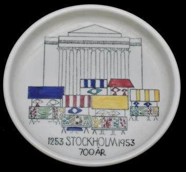 Väldigt snyggt fat från Stockholms 700-årsjubileum 1953. Det är också Marianne Westman. Tyvärr är ju ett fat inte precis det man behöver men dekoren är fin ändå. Så stiliserad men man vet ju ändå precis var det är. Hötorget. Nån är villig att betala 150 kr.
