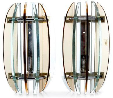 Vägglamporna är italienska och från företaget VECA. Stommen är i förkromad metall och de slipade glasskivorna är svagt brun- respektive gröntonade. Kan inte ett smack om italiensk design men hittade följande upplysning på nätet: